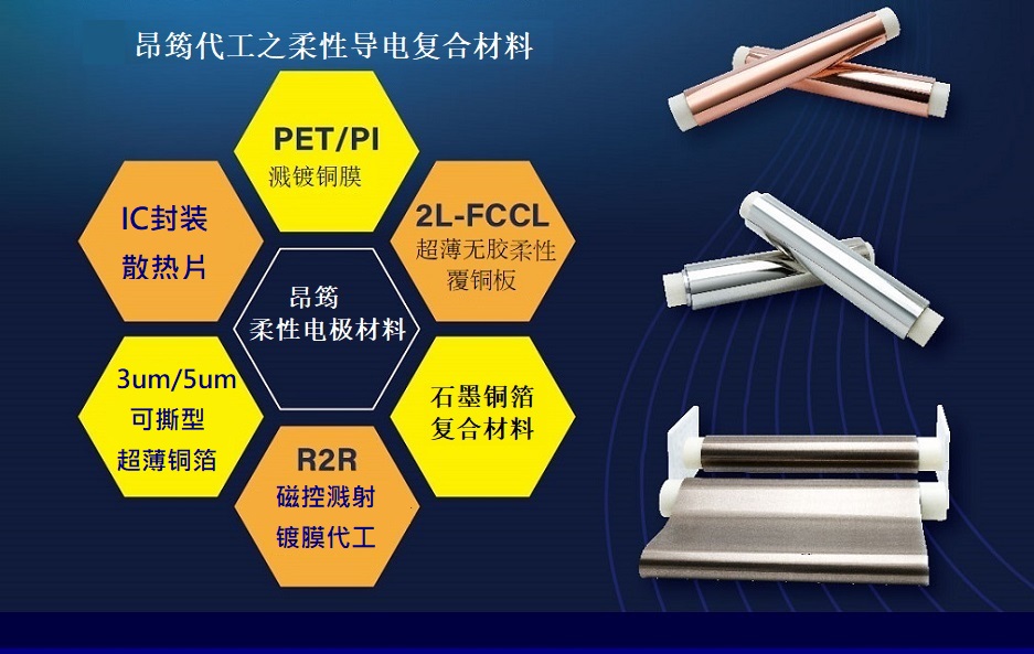 我们同时提供卷对卷真空溅镀代工服务,协助全球客户开发轻薄型、柔性化、具功能性的溅镀型电子薄膜材料,应用于透明LED显示屏、软性电路板及IC载板、触控面板、电子散热、EMI电磁屏蔽等领域。
